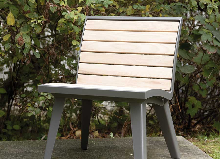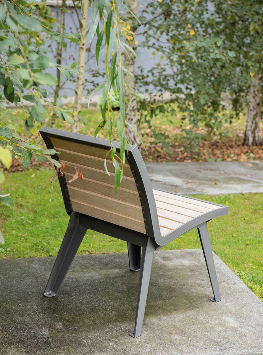 Its constructive principle - available in benches, tables and chaise longue... - embed a wooden sheet in a steel frame. The versatile seat style of the Montréal wood chair, as pleasant sitting as when getting up, is the fruit of 20 years of research. Designed like an origami, the feet in folded steel are adapted to the constraints of urban spaces and evokes the finesse of an interior furnishing.